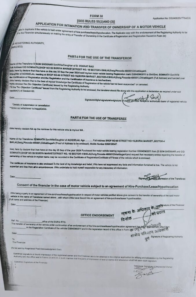 वाहन को देने के पश्चात आंध्रा प्रदेश में काम करने चले गए थे और उसके बाद साउदी अरब में काम मिलने के बाद साउदी जाकर रहने लगे। गाड़ी किश्त का बकाया कई महीने ना पटाने पर घर पर श्रीराम फाइनेंस के लोग पहुंचते थे तब पता चलता था कि वाहन किश्त नही पट रहा है, तब जानकारी मिलने पर लखविंदर सिंह को बताने पर बकाया राशि देते थे। किश्त की राशि जमा हो जाने पर फाइनेंस कंपनी कई महीने तक नही आते थे नही आने के कारण वाहन के किश्त की सही जानकारी नही मिल पाता था । कई वर्षों बाद अचानक श्रीराम फाइनेंस कंपनी के बकाया राशि लेने के लिए घर पर पहुंचने से जानकारी होता है कि क्रेन वाहन का अभि तक किश्त पूरी नहीं पटा है। किश्त नही पटने की जानकारी लेने के लिए साल 2020 में लखविंदर सिंह को फोन करने पर पता चलता है कि कोराना के समय उनका देहांत हो गया है। वाहन की जानकारी मेरे अनुपस्थिति में पिताजी एवं रिश्तेदारों की ओर पता लगाया जाता है कि सेक्टर 4 निवासी सोमनाथ जयसवाल नामक व्यक्ति के पास रखा हुआ है और क्रेन वाहन को बीएसपी के भीतर में चला रहा है। वाहन को लेने के लिए पिताजी एवं रिश्तेदार सोमनाथ जयसवाल मांगने पर देने से मना कर देता था। बकाया वाहन की किस्त को लेने के लिए श्रीराम फाइनेंस की ओर से बार बार परेशान करने के चलते वाहन हमारे पास नहीं रहने के बाद भी बकाया राशि को पिताजी के द्वारा 1 लाख 35 हजार रुपए जमा कराया गया परंतु वाहन का एनओसी मेरे अनुपस्थिति में सोमनाथ जायसवाल को दे दी गई। वाहन के संबंध में पता चलने पर फोन द्वारा सोम जयसवाल से जानकारी लेने पर सोमनाथ जयसवाल की ओर से बताया गया है कि वह बहन को खरीद चुका है । उसके बाद आरटीओ आदि से दस्तावेज निकालने पर पता चलता है कि उनके अनुपस्थिति में उनके नाम का गलत तरीके से हस्ताक्षर तथा गलत तरीके से नोटरी आदी दस्तावेज बनाकर वाहन को सोमनाथ जयसवाल ने अपने नाम से कर लिया है। जिसके खिलाफ में वकील के माध्यम से 16 जुलाई 2025 को नोटिस भेजी गई, जिसका जवाब तक नही दिया गया। भट्टी थाने में शिकायत न लेने पर पिताजी स्वर्गीय डी वेंकट राव द्वारा 30 दिसम्बर 2024 को नगर पुलिस अधीक्षक के पास लिखित शिकायत देकर अवगत कराया गया। शिकायत के बाद भट्टी पुलिस थाना में जांच होता रहा पर कोई कार्रवाई नही होने पर 23 अप्रेल 2025 को पुलिस अधीक्षक के पास लिखित रूप से शिकायत फिर की गई परंतु वाहन न मिलने की परेशानी से पिताजी की तबीयत बिगड़ने के चलते अक्टूबर 2025 को उनकी मृत्यु हो गई। मृत्यु के उपरांत छुट्टी लेकर भिलाई पहुंचने के बाद पिताजी का कार्यक्रम कर लेने के बाद 4 दिसम्बर को पुलिस अधीक्षक के पास मेरी ओर से लिखित शिकायत दी गई, जिसकी जांच पद्मनापुर थाने में महीने भर से की जा रही है और दस्तावेज जमा करने एवं 27 दिसम्बर को वापस साउदी अरब जाने की 