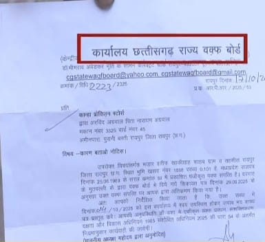 छत्तीसगढ़ राज्य वक्फ बोर्ड ने रायपुर के पुरानी बस्ती इलाके में 75 साल से रह रहे हिंदू परिवारों को नोटिस जारी किया है। वक्फ बोर्ड का दावा है कि इन परिवारों के मकान वक्फ बोर्ड की जमीन पर हैं और उन्हें 2 दिन के अंदर कलेक्टर के सामने पेश होकर जवाब देने को कहा गया है अन्यथा कार्रवाई की जाएगी। यह नोटिस दिवाली से एक दिन पहले जारी किया गया था, जिससे लोगों में नाराजगी है। लोगों का कहना है कि उनके पास 1965 और 1948 के रजिस्ट्री पेपर्स हैं और इतने सालों में वक्फ बोर्ड को अपनी जमीन का ख्याल नहीं आया ।तीन हिंदू परिवारों को यह नोटिस मिला है, जिससे उनमें दहशत का माहौल है और विरोध हो रहा है ।