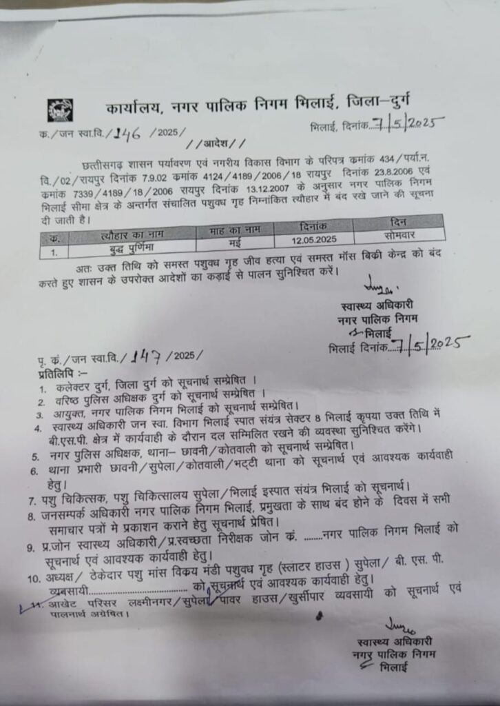 भिलाई : छत्तीसगढ़ शासन पर्यावरण एवं नगरीय विकास विभाग के आदेशानुसार नगर पालिक निगम भिलाई सीमा के अंतर्गत संचालित पशुवध गृह एवं समस्त मांस विक्रय की दुकान 12 मई सोमवार बुद्ध पूर्णिमा के दिन बंद रहेगी ।12 मई सोमवार बुद्ध पूर्णिमा पर पूरे प्रदेश में नॉनवेज की बिक्री पर रोक रहेगी। सभी मीट दुकानों को बंद रखने का आदेश जारी किया गया है। बिक्री किए जाने पर कानूनी कार्रवाई की जाएगी। आदेश के मुताबिक भिलाई नगर निगम के संपूर्ण परिक्षेत्र में स्थित पशु वध गृह और सभी मांस बिक्री दुकानों को बंद रखा जाएगा। वहीं किसी भी दुकान में मांस बिक्री करते पाए जाने पर जब्ती और कार्रवाई की जाएगी।भिलाई नगर निगम स्वास्थ्य अधिकारी ने सभी जोन के स्वास्थ्य अधिकारी और स्वच्छता निरीक्षकों को आदेश का पालन करने के लिए कहा है। वहीं संबंधित क्षेत्र में लगातार निरीक्षण करने के निर्देश दिए गए हैं।