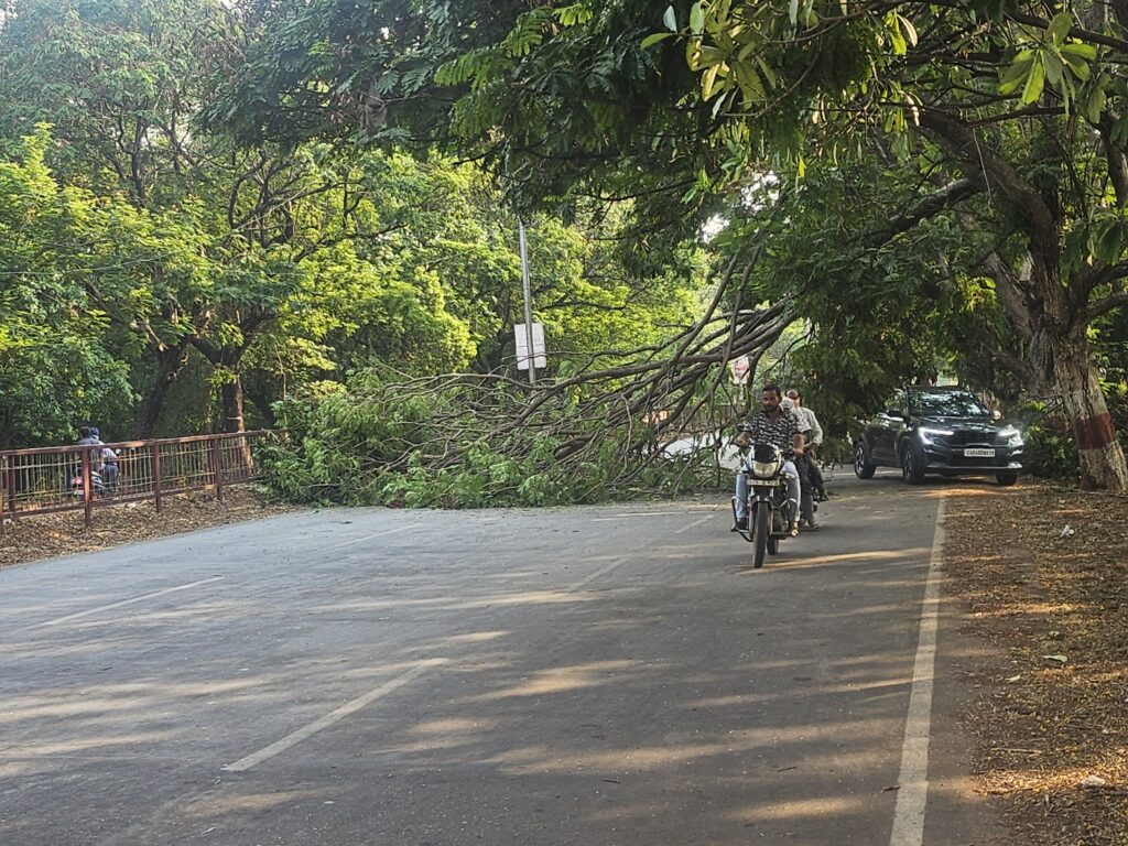 इन दिनों बारिश के मौसम में तेज हवा में पेड़ के गिरने का सिलसिला जारी है। आज शनिवार को बिना बारिश के भिलाई सेक्टर 5 चौक मार्ग से सेक्टर 1 जाने वाली मार्ग सड़क जुबली पार्क के किनारे पेड़ का एक बड़ा डंगाल गिर गया। गनीमत रही कि जिस समय पेड़ का डंगाल गिरा उस समय मौके सड़क पर कोई वाहन या व्यक्ति नहीं था। सड़क पर पेड़ का डंगाल गिरने से वाहन जाम में अनेकों लोग फंस गए। देखते ही देखते वाहनों की लंबी कतार भी लग गई। जाम में फंसे वाहन चालकों के द्वारा वाहन को टर्न कर दूसरी दिशा से वाहन ले गए, वहीं कही लोग रिक्स लेकर पेड़ के किनारे नीचे से वाहन लेकर जाते दिखे गए। जहां भिलाई नगर निगम के महापौर की वाहन भी जाते देखा गया। वाहन के लम्बी कतार को देखते हुए ईगल आई वर्ल्ड न्यूज ने 112 में सूचना देकर घटना की जानकारी दी गई। खबर लिखे जाने तक तक सड़क पर गिरे पेड़ के डंगाल को हटाने का कोई कार्य अभी तक नही हुआ केवल पुलिस विभाग द्वारा सुरक्षा की दृष्टि से रेलिंग लगाकर यातायात व्यवस्था रोक दिया गया है ।
