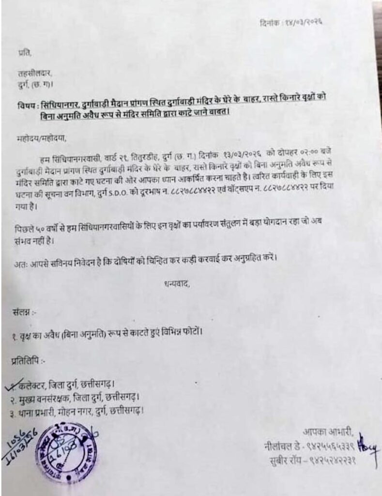 दुर्ग स्थानीय रहवासी सुबीर रॉय एवं नीलांचल डे ने दुर्ग तहसीलदार को जिला कलेक्टर के नाम लिखित ज्ञापन सौंपकर आरोप लगाया है कि दुर्गाबाड़ी मैदान परिसर स्थित दुर्गा मंदिर के आसपास सड़क किनारे लगे हुए पेड़ों को बिना अनुमति से काटा जा रहा है।