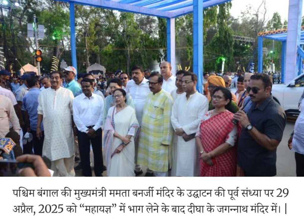 बंगाल के शांत और समुद्र तटीय शहर दीघा में ममता बनर्जी ने 22 एकड़ में 250 करोड़ रुपए की लागत से पांच सालों में भव्य जगन्नाथ मंदिर बनवाया है और ये मंदिर आज से जनता के लिए खोल दिया गया । मंदिर पश्चिम बंगाल हाउसिंग इंफ्रास्ट्रक्चर डेवलपमेंट कॉर्पोरेशन ने बनवाया है। बेशक ये मंदिर बहुत खूबसूरत और भव्य है, लेकिन विपक्ष आरोप लगा रहा है कि हिंदुओं की राजनीति करने के लिए ममता ने ये मंदिर बनवाया है। विपक्ष का आरोप है कि सरकार खुद अपना पैसा खर्च करके कोई धार्मिक स्थान नहीं बनवा सकती।