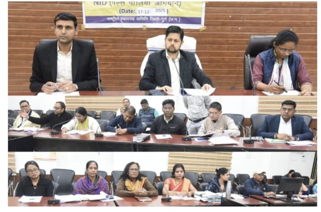 राष्ट्रीय टीकाकरण दिवस (एनआईडी) पल्स पोलियो अभियान की तैयारियों के संबंध में दुर्ग जिला कलेक्टर अभिजीत सिंह की अध्यक्षता में कलेक्ट्रेट सभाकक्ष में जिला टास्क फोर्स की बैठक आयोजित की गई। “देश का भविष्य बचाओ, पोलियो की दवा हर बार पिलाओ” के संदेश के साथ राष्ट्रीय पल्स पोलियो अभियान 2025 के अंतर्गत जिले में व्यापक स्तर पर तैयारियां पूरी कर ली गई हैं।अभियान के प्रथम दिवस 21 दिसंबर 2025 को बूथों पर तथा 22 व 23 दिसंबर को मॉप-अप दिवस के दौरान घर-घर जाकर 0 से 5 वर्ष तक के बच्चों को पोलियो की अतिरिक्त खुराक पिलाई जाएगी। इस अभियान के तहत दुर्ग जिले में कुल 2,59,188 बच्चों को पोलियो की दवा पिलाने का लक्ष्य निर्धारित किया गया है। जिले में 0–5 वर्ष आयु वर्ग के शत-प्रतिशत बच्चों को पोलियो की खुराक देना अनिवार्य किया गया है।