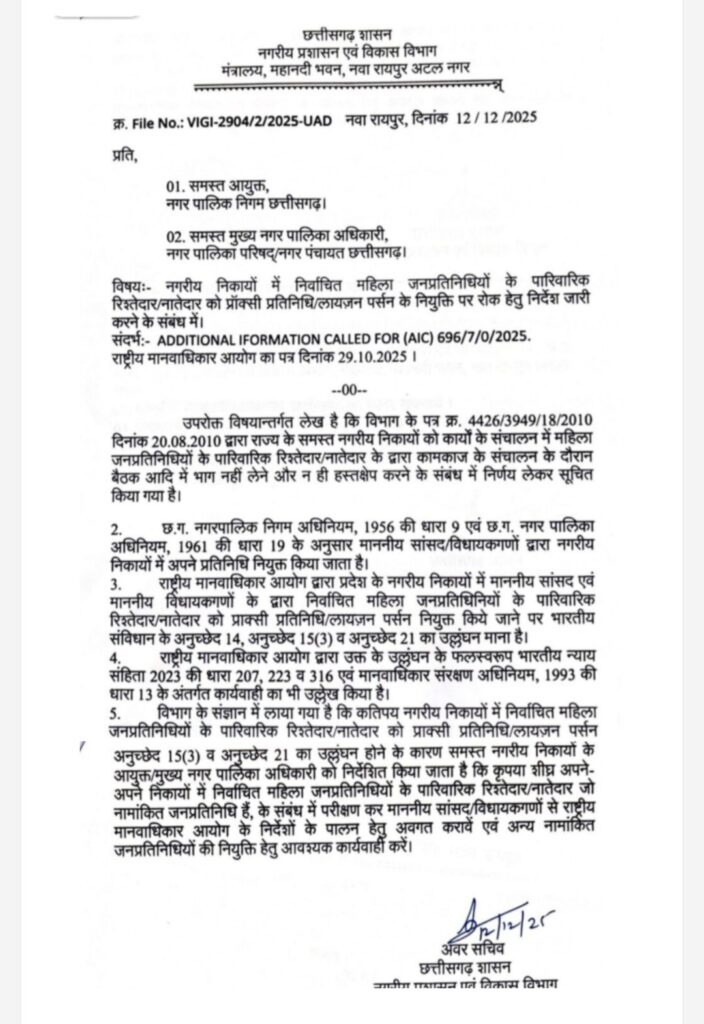 छत्तीसगढ़ के नगरीय निकायों में महिला जनप्रतिनिधियों के नाम पर उनके पति, भाई या रिश्तेदारों द्वारा सत्ता चलाने के दौर पर अब कानूनी हंटर चलने वाला है। छत्तीसगढ़ शासन के नगरीय प्रशासन एवं विकास विभाग ने एक बेहद सख्त आदेश जारी करते हुए महिला पार्षदों और जनप्रतिनिधियों के रिश्तेदारों को ‘प्रॉक्सी प्रतिनिधि’ या ‘लायजन पर्सन’ नियुक्त करने पर तत्काल प्रभाव से रोक लगा दी है। संविधान और मानवाधिकारों का हवाला विभाग द्वारा जारी पत्र (File No.: VIGI-2904/2/2025-UAD) में स्पष्ट किया गया है कि निर्वाचित महिला प्रतिनिधियों के कामकाज में उनके रिश्तेदारों का हस्तक्षेप न केवल प्रशासनिक नियमों का उल्लंघन है, बल्कि यह भारतीय संविधान के अनुच्छेद 14, 15(3) और 21 का भी सीधा उल्लंघन है। राष्ट्रीय मानवाधिकार आयोग ने इस मुद्दे को गंभीरता से लेते हुए इसे महिलाओं के संवैधानिक अधिकारों का हनन माना है। इस आदेश की सबसे धारदार बात यह है कि इसमें केवल विभागीय कार्रवाई की चेतावनी नहीं दी गई है, बल्कि कानूनी कार्रवाई का भी उल्लेख है। आदेश में साफ कहा गया है कि उल्लंघन की स्थिति में:भारतीय न्याय संहिता 2023 की धारा 207, 223 और 316 के तहत कार्रवाई की जा सकती है।मानवाधिकार संरक्षण अधिनियम 1993 की धारा 13 के अंतर्गत भी कड़े कदम उठाए जा सकते हैं।
